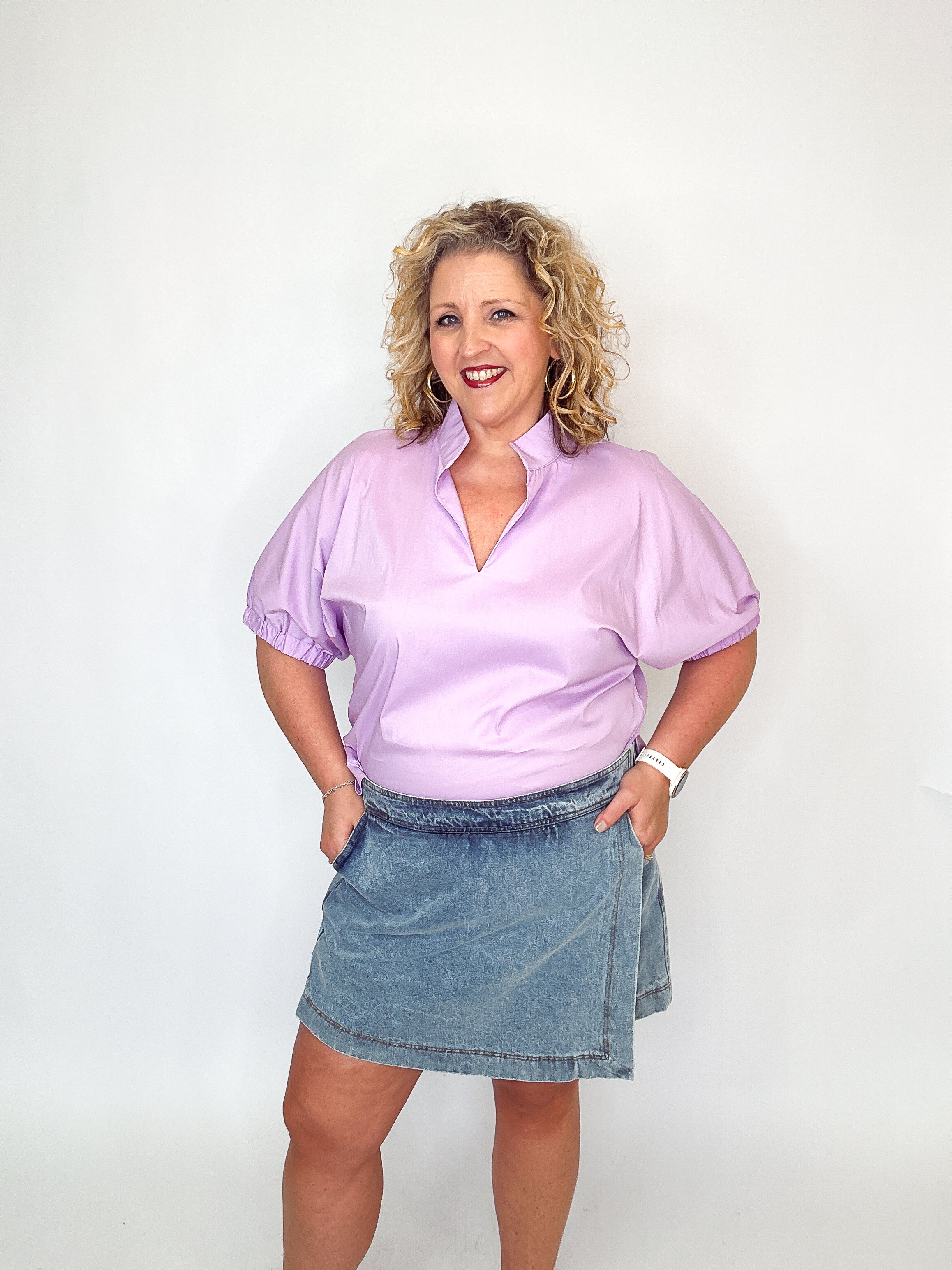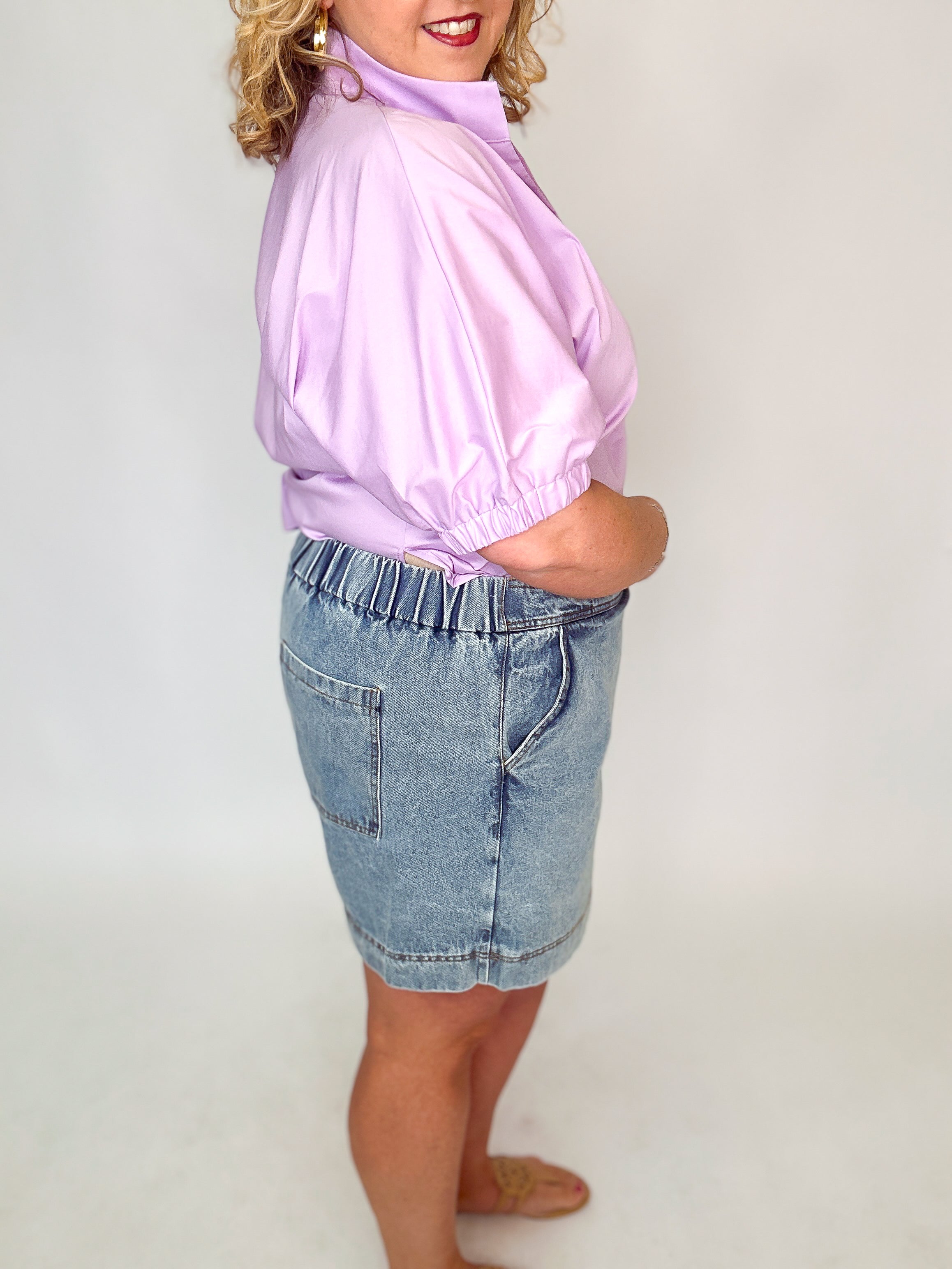 This denim overlap skort from Sew In Love delivers the perfect blend of casual charm and everyday comfort. Designed with a wrap-style front, it gives the appearance of a mini skirt while offering the confidence and ease of built-in shorts underneath. Finished with classic back patch pockets and a secure zip closure, this skort is both stylish and practical. A versatile wardrobe staple, it pairs effortlessly with tees, tanks, or lightweight sweaters for an on-trend, laid-back look.