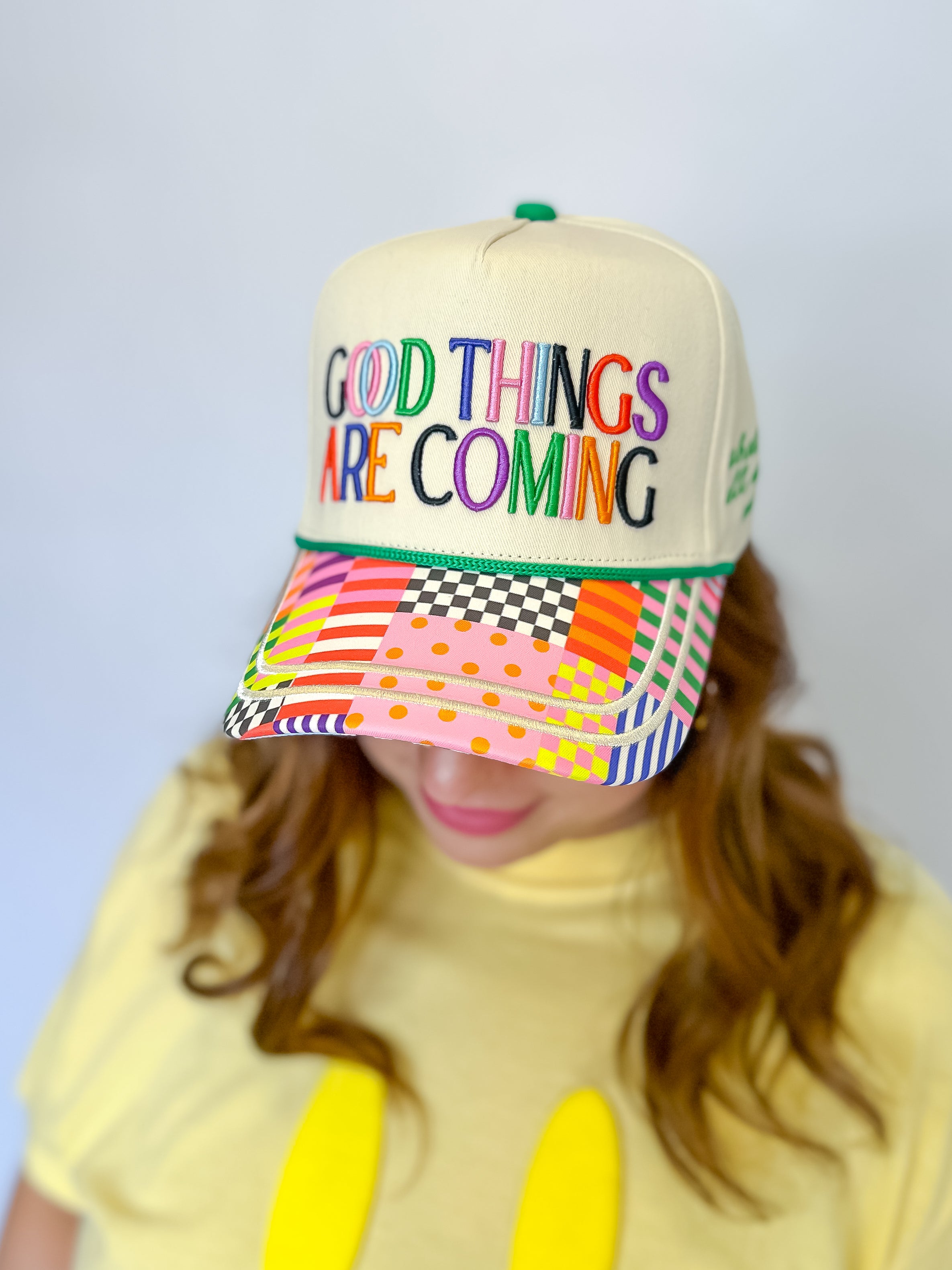 The “Good Things Are Coming” Hat is your daily reminder to stay expectant and keep believing. Featuring vibrant multicolor embroidered lettering across the front, this feel-good favorite instantly adds a pop of positivity (and color!) to any outfit.