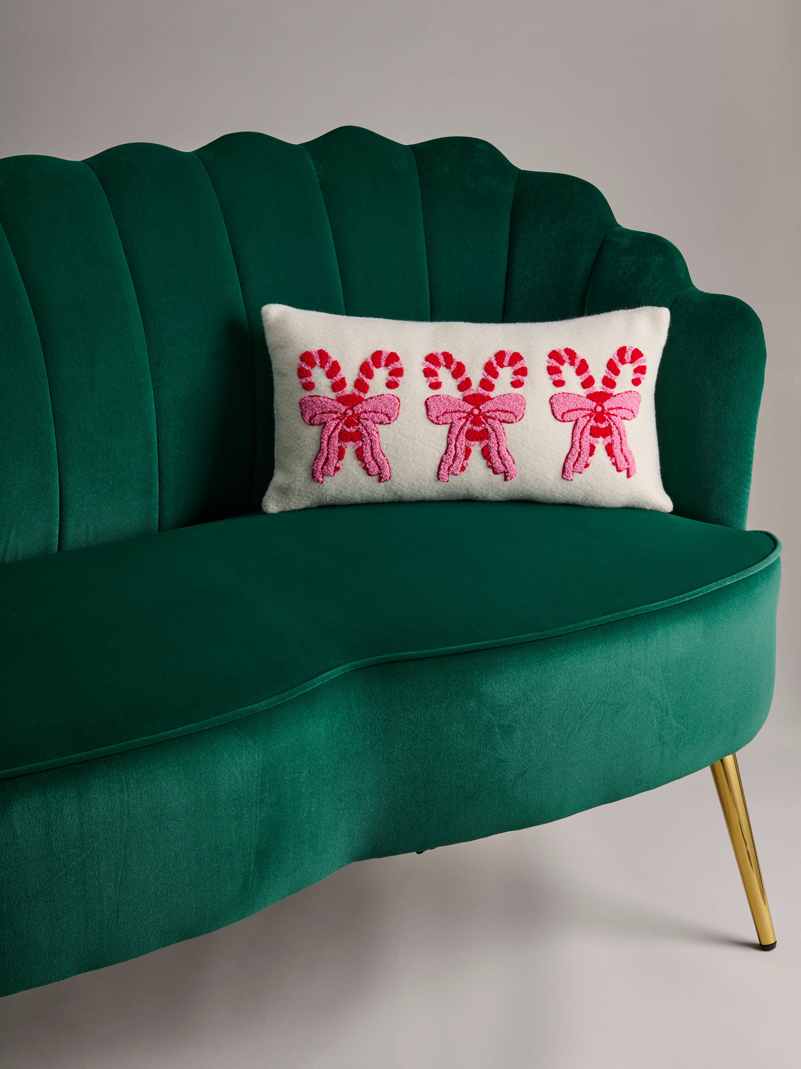 Made from polyester with a removable polyfill insert, Add a sweet touch to your holiday decor with the Pretty Candy Cane Pillow. This cream-colored lumbar pillow features three candy cane pairs, each tied up in sparkly pink bows with vibrant red embroidery. Its festive, feminine design brings a playful pop to your sofa, bench, or bed. Complete with a removable polyfill insert, it’s as functional as it is fabulous.