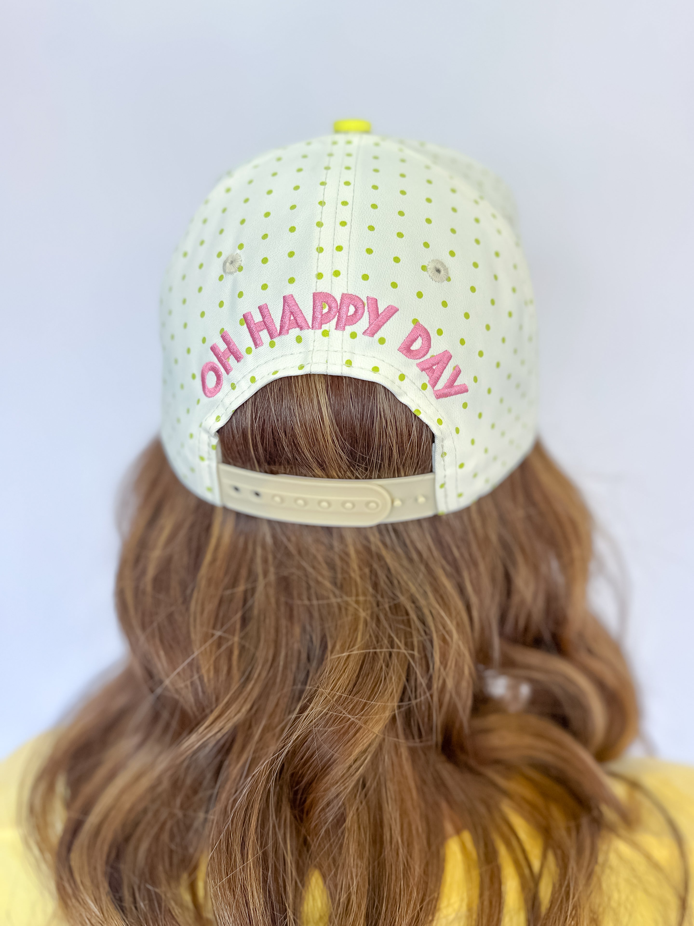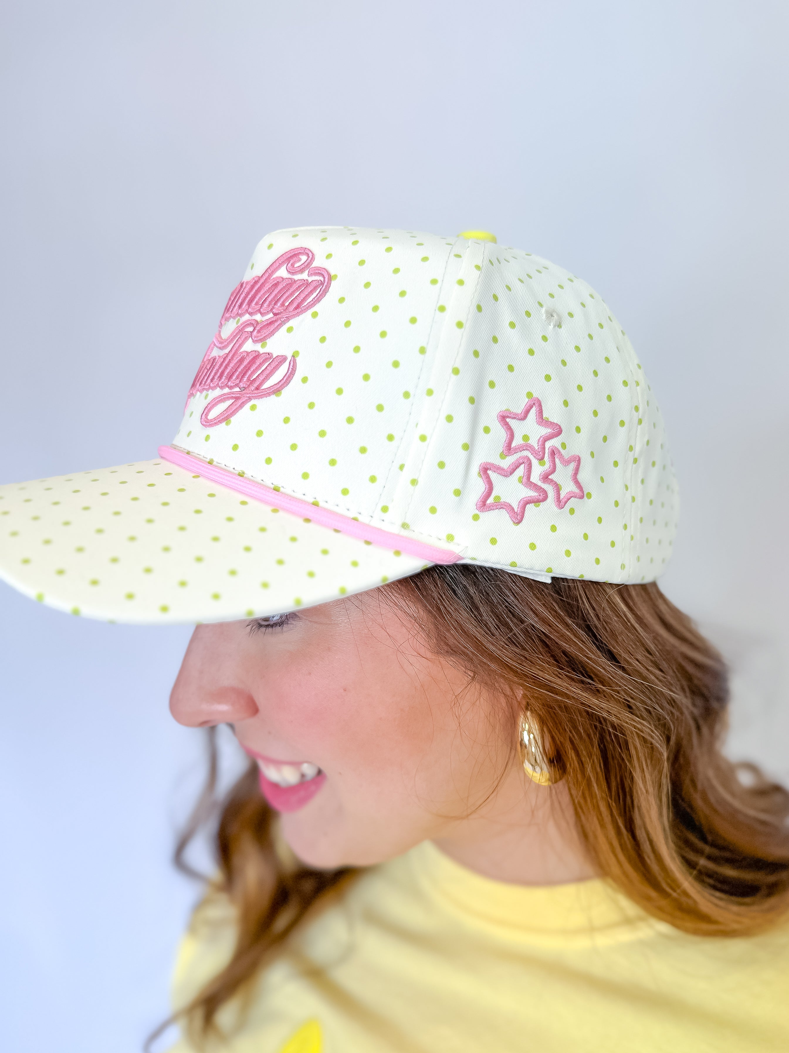 Designed for slow mornings, spontaneous brunches, and sunshine-filled adventures, this effortlessly chic cap features soft pink embroidered lettering with matching pink trim for the sweetest pop of color. The dreamy ivory base is playfully accented with delicate sage polka dots, creating the perfect balance of fresh and feminine. Three pink embroidered stars on the side add an extra touch of charm and whimsy — the perfect little detail that makes this piece shine from every angle ✨