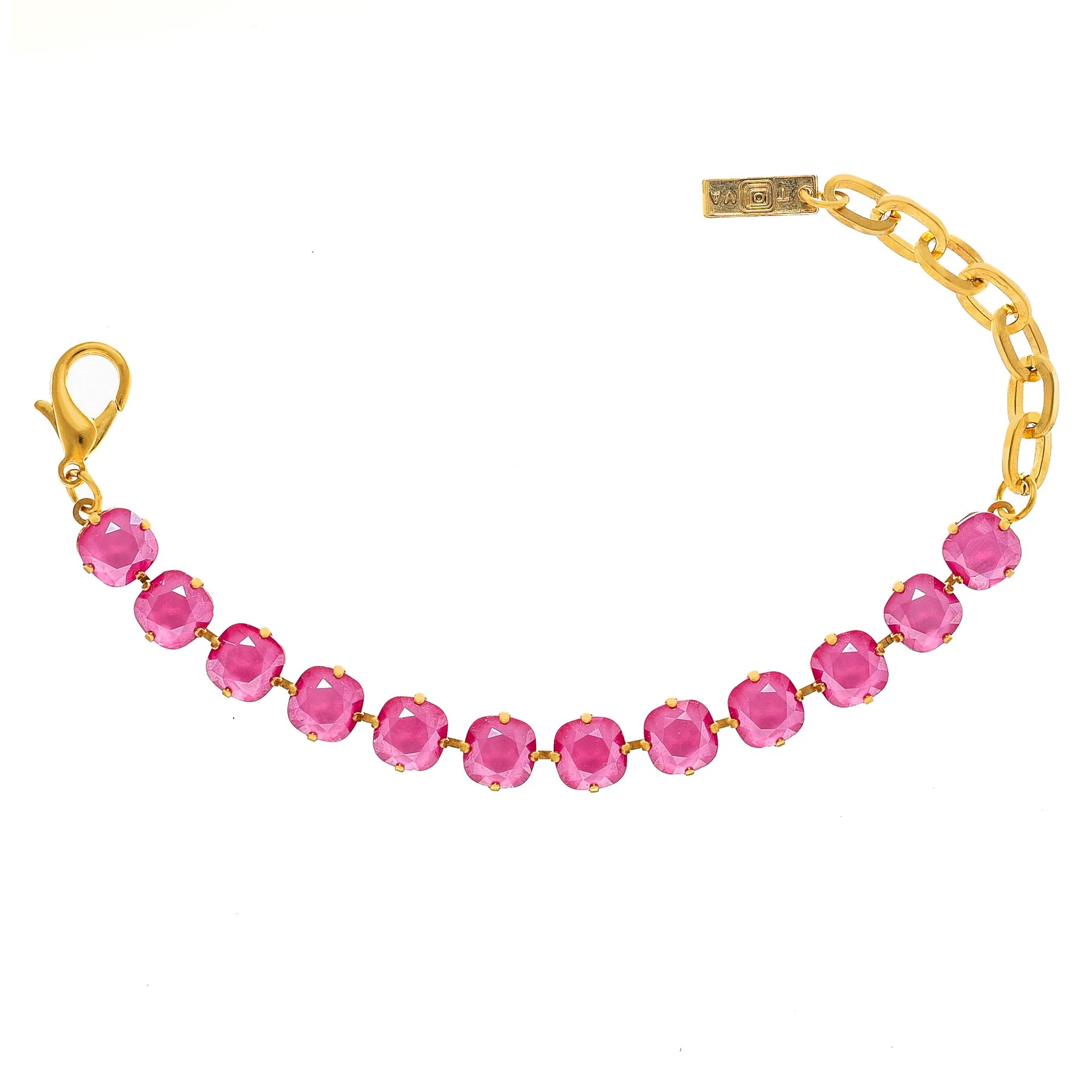 Glam up any look with the Mini Indra Bracelet in Pink Peony. This treasure is crafted from antique gold plated brass with high-quality crystals, and it'll be right at home with your already-fabulous wardrobe. It measures 5.5" in length with a 2" extension, and it's proudly made in Canada! Shine on, my friend–this one's a real knockout!