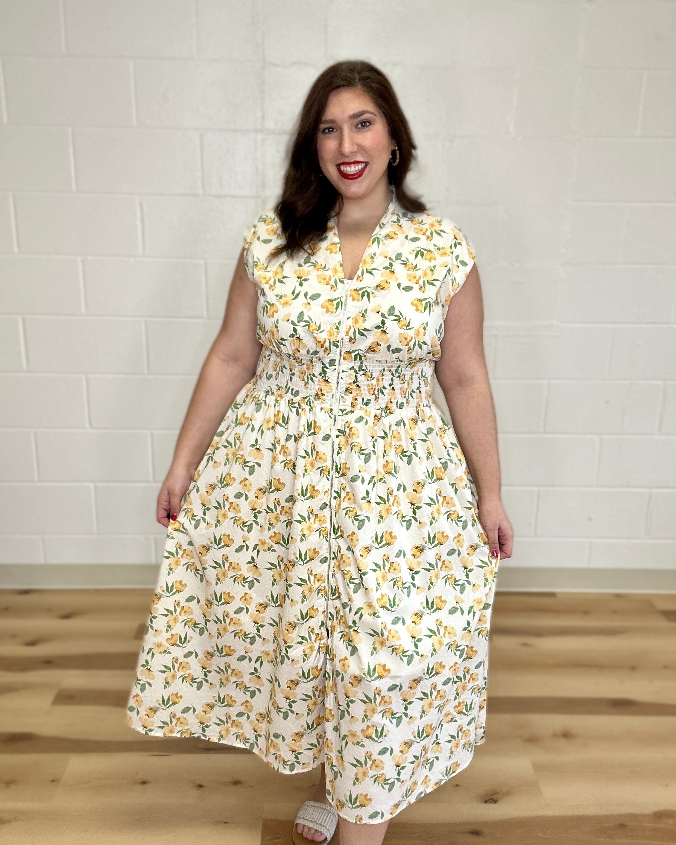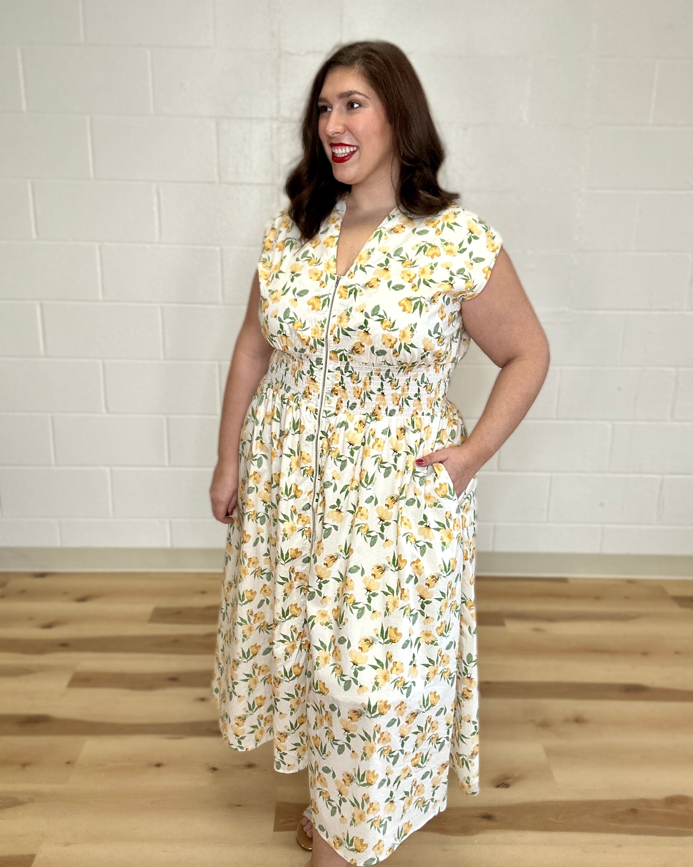 Effortless elegance meets everyday comfort in this stunning midi dress. The relaxed drop shoulder silhouette flatters all frames, while the smocked waist creates a refined, defined shape. Front zip closure offers easy on-and-off convenience, and practical pockets keep your essentials close. Vibrant floral print brings a fresh, feminine touch perfect for brunch, errands, or casual outings. A versatile wardrobe essential that transitions seamlessly from season to season.